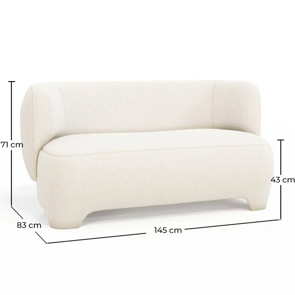 Immerse yourself in contemporary luxury with our two-seater sofa upholstered in exquisite bouclé fabric. This sofa features a modern design with curved shapes that bring elegance and sophistication to any space. The bouclé fabric, known for its soft and inviting texture, provides a luxurious tactile experience. The additional detail of the sheepskin fabric further enriches the comfort sensation, creating a warm and welcoming atmosphere. Designed with excellence in mind, this sofa not only offers comfort but also is a testament to superior quality, perfect for hotels and restaurants aiming to elevate their guests' experience with designer furniture.
