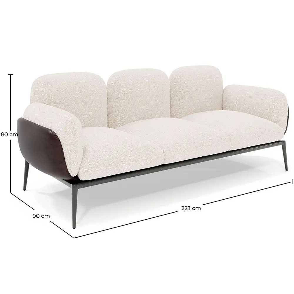 Let us introduce you to our 3-seater sofa upholstered in bouclé fabric, a piece of furniture that combines style, comfort, and elegance in perfect harmony. With its sophisticated design and clean lines, it will become the centerpiece of any living room, office, hotel, or waiting room, adding a touch of distinction to your space. Its bouclé fabric upholstery is not only visually appealing but also adds a soft and comforting texture to the touch, providing a unique sensory experience. The outer structure is upholstered in dark vegan leather to contrast with the cushion upholstery, giving it an unparalleled modern touch. With its modern design, exceptional comfort, and high-quality materials, this sofa will be the ideal place to relax and enjoy unforgettable moments.