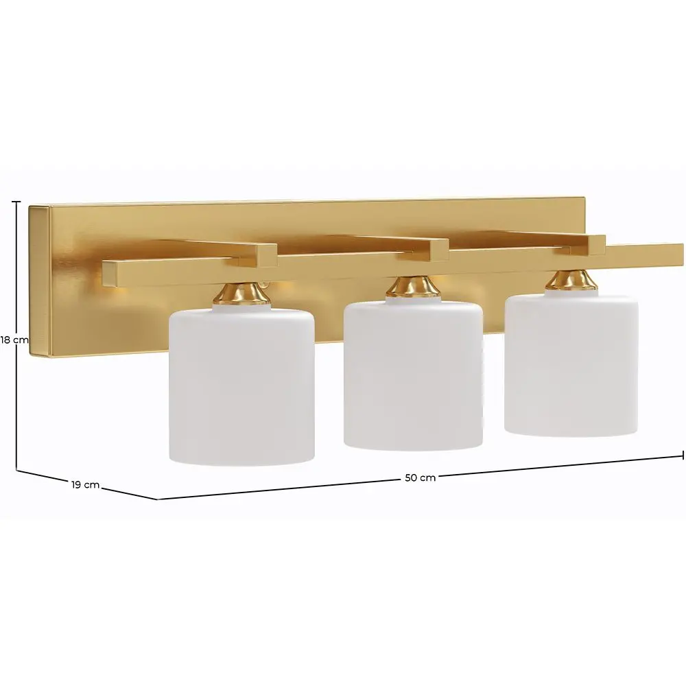 The structure is made of aged gold metal, giving it a timeless air and a vintage touch that adds personality to its design. Each light point is equipped with a beautiful white glass shade, which diffuses the light evenly and softly, creating a cozy and pleasant atmosphere. The purity of the white glass perfectly complements the warm glow of the golden metal, creating a visually appealing play of contrasts.