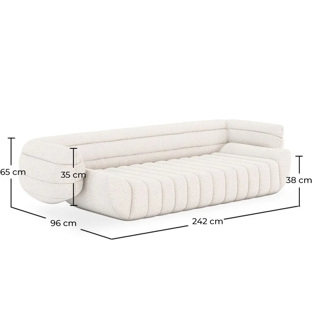 This 3/4-seater sofa upholstered in boucle fabric is perfect to add a modern and elegant touch to your living room. Its extra long seat, upholstered in imitation sheepskin wool, is ideal to provide great comfort while relaxing or enjoying the company of family and friends. This luxurious design is made with premium quality materials, meaning this sofa will lasts for many years without losing its elegance and your investment will be rewarded.