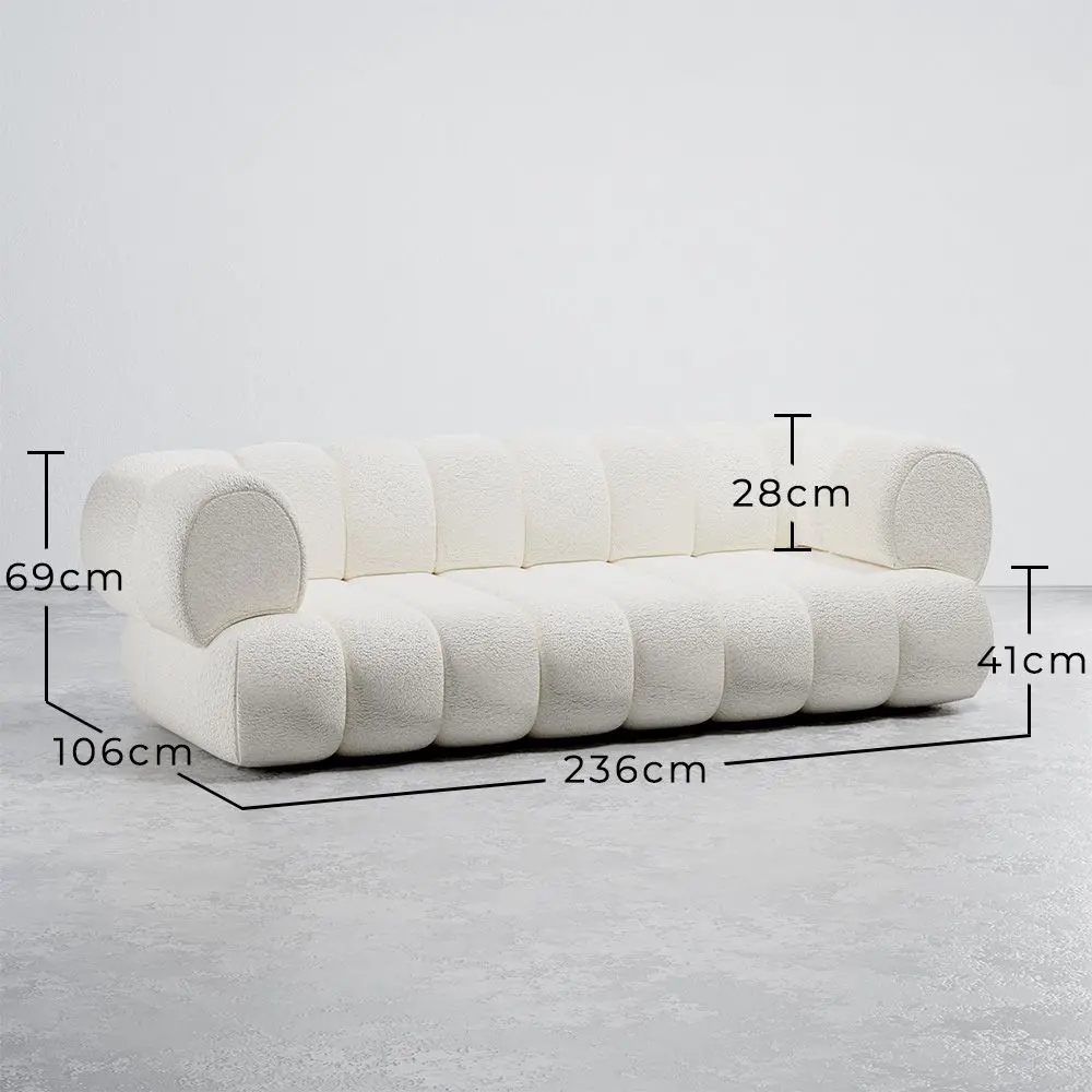 With a design that redefines luxury and comfort, this 2/3-seater sofa in bouclé fabric is the perfect choice to transform your spaces. Its bouclé upholstery, with a soft and cozy texture reminiscent of lamb’s wool, gives it a unique character that perfectly complements its contemporary style. This sofa has been designed with comfort in mind, featuring a plush and spacious seat that invites relaxation, making it an indispensable piece for both commercial and home environments.