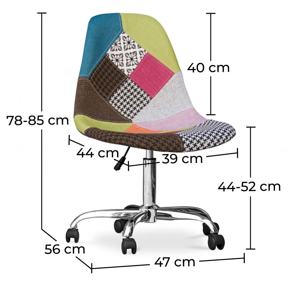 Do you love patchwork, and are you looking for a new desk chair? Then this patchwork office chair might very well be your next addition to your home. Notice its ultra-sleek looks. Most prominent perhaps is its seat material, which is upholstered in patchwork fabric. It features a plethora of charming colors. Do you want to easily move your next desk chair around your office or living room? No problem! It can easily be done with this one, as it features five steel legs with wheels. It's also easy to adjust the chair's position, with its swivel seat and its adjustable height.