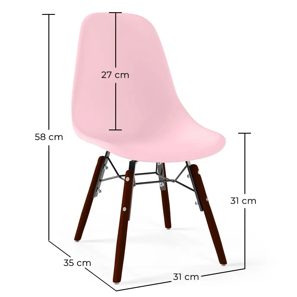 If you're looking for a children's chair that combines design, ergonomics, and durability, this is the ideal choice. Inspired by an iconic piece of interior design, its polypropylene seat provides a comfortable and secure posture, while its dark wood legs with metal reinforcement ensure stability and strength. Perfect for any children's space, adding an elegant and functional touch.