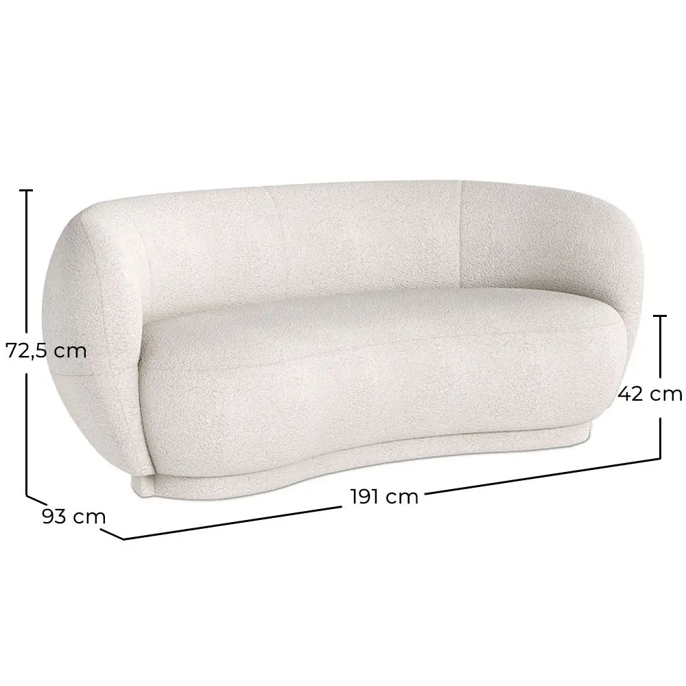 Minimalism takes over this 3-seater curved sofa with boucle upholstery in a charming off-white colour. As the legs are hidden, the sofa seems to float in the air! Your living room will become radically modern if you choose this curved sofa, as boucle fabric upholstery and organic shaped furniture are two of the strongest decoration trends. This curved design sofa is perfect if you're looking to add an elegant touch to your home or commercial space such as a hotel, restaurant, or waiting room...