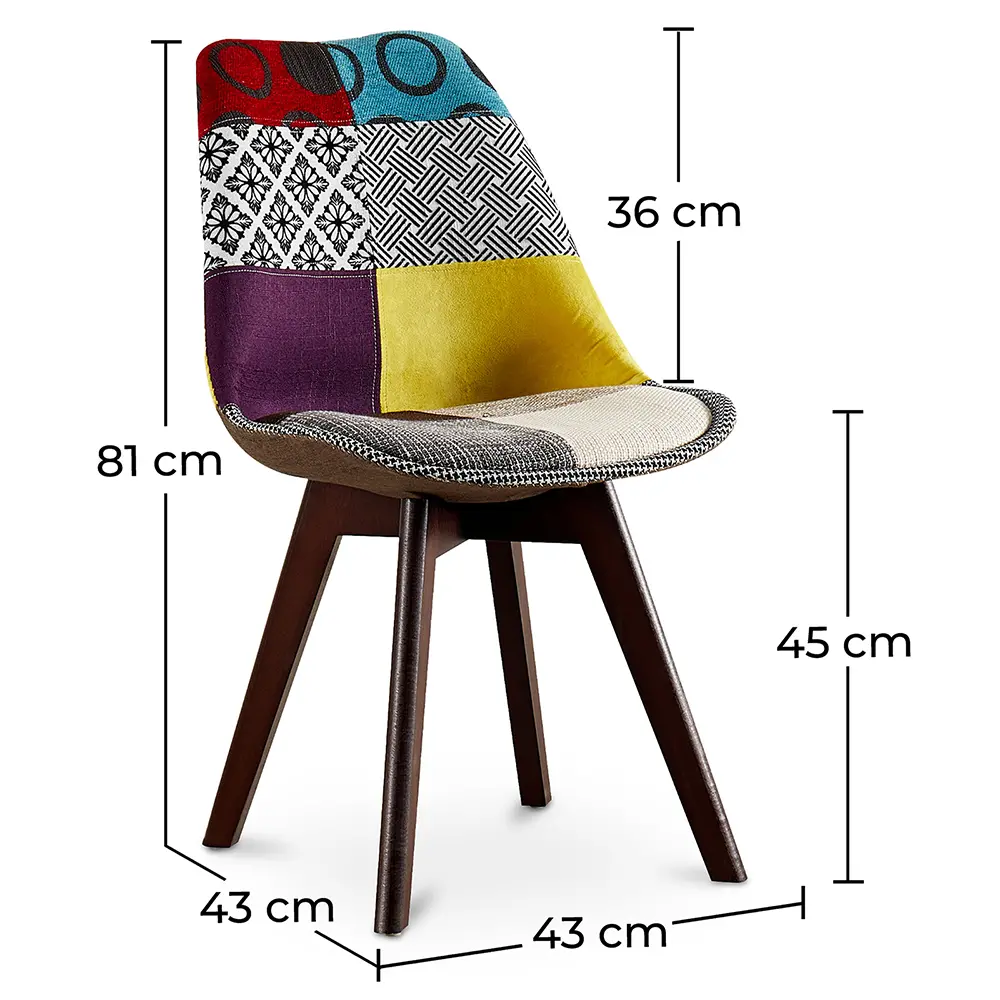 You will love this Brielle design multicolor patchwork dining chair for its retro scandinavian style. Its legs made of dark wood give it a simple and classy look. The fabric upholstery ensures comfort and the Jay patchwork model brings freshness. This chair model is part of the new premium edition. Enjoy its comfort. Best fit for a dining room at home as well as for hotels and restaurants.