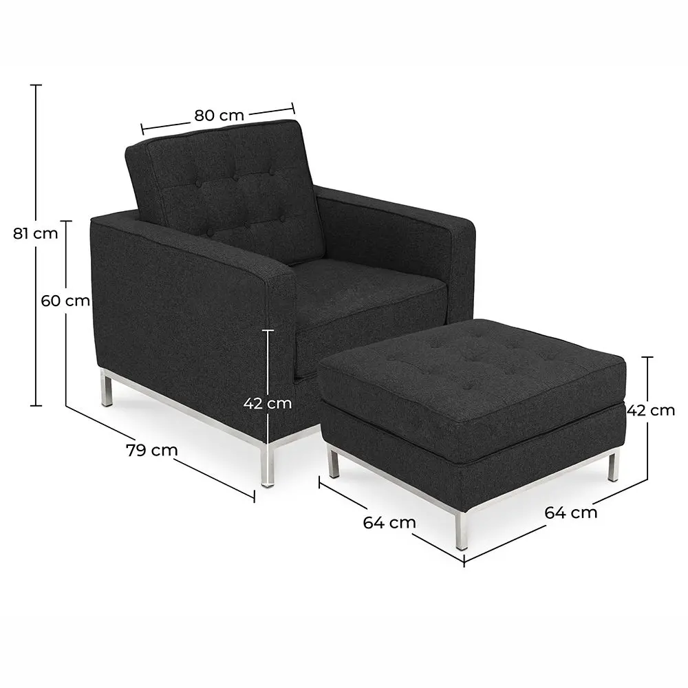 The Kanel Armchair with Matching Ottoman is no exception to this rule. Its straight lines and square shape lend a great deal of poise and elegance to this armchair. The cashmere upholstery gives it a very refined touch. Adding an extra cushion to the seat will only increase the comfort of this chair. It will fit easily into your living room or office and the footrest matches the chair perfectly.