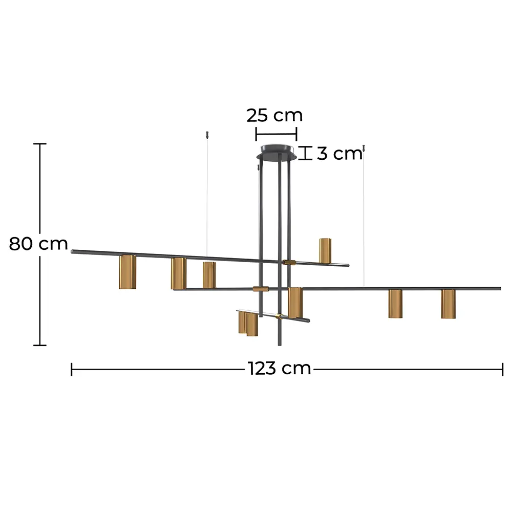 Rela is a modern hanging light. A chandelier can defuse up to nine lights. It has vertical and horizontal black poles and gold cylinder-shaped shades. This light fixture looks great in a living room, bedroom, dining room, or foyer, and creates modern and clean lines in an interior.