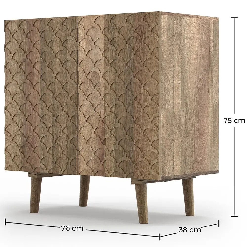 Mango wood cabinet with four compartments and decorative doors behind which you can hide all your things. The wooden element will add warmth to your living room, or dining room.