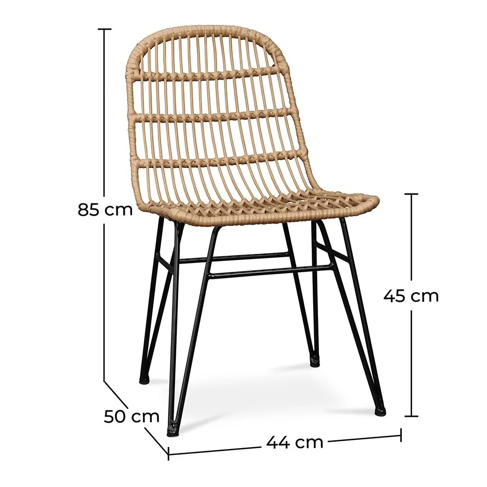 Thanks to its synthetic rattan seat, this dining chair will bring a touch of exoticism to your home. A synthetic rattan chair with black metal legs updated according to current tastes. Its slightly inclined legs are a nod to vintage design. Add a cheerful and exotic touch to this magnificent chair with a coloured cushion.