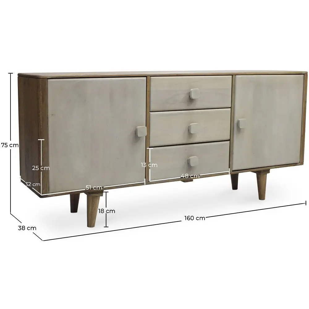 Iona is a 2-door 3-drawer vintage sideboard. It provides significant storage space, and is a decor piece for your living room, hallway or bedroom. The wood texture offers a soft, natural feel. It is a 2 door sideboard with three shelves that hide plenty of storage space. This unit is unique and classy.