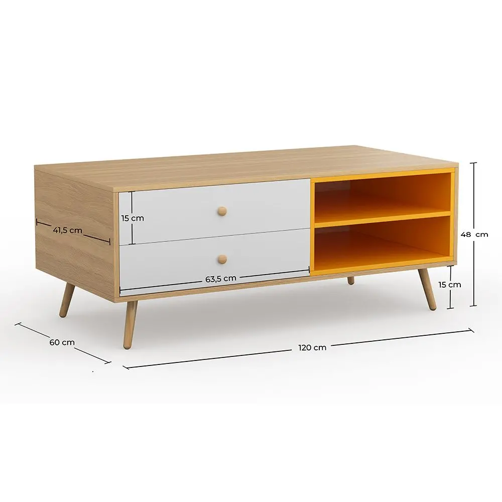 We love this vintage scandinavian style TV unit. It is a wooden sideboard, with slender legs made of pine wood and a structure made of particle board. It is colourful, has a combination of white, grey and yellow drawers and shelves, and offers lots of storage space. A stylish and playful piece of furniture to add to your living space!